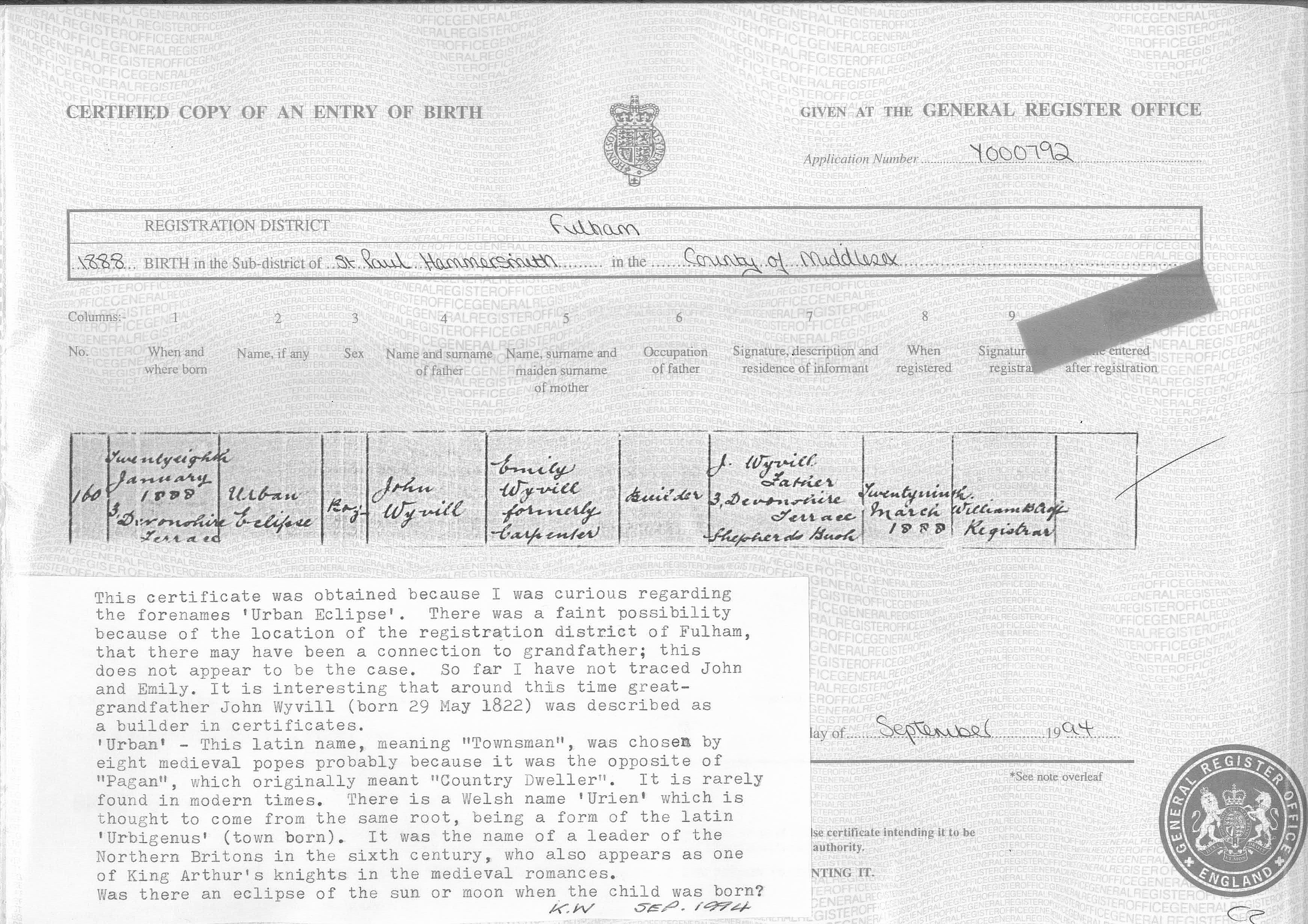 Urban Eclipse Wyvill was born March 1888 in Notting Hill, London to John Wyvill and Emily Carpenter who named him after the solar eclipse on 19th August 1887. Although on his birth certificate, registered in Fulham, his mother was Emily Wyvill and noted as formerly Carpenter, there is no proof of any marriage to John Wyvill!